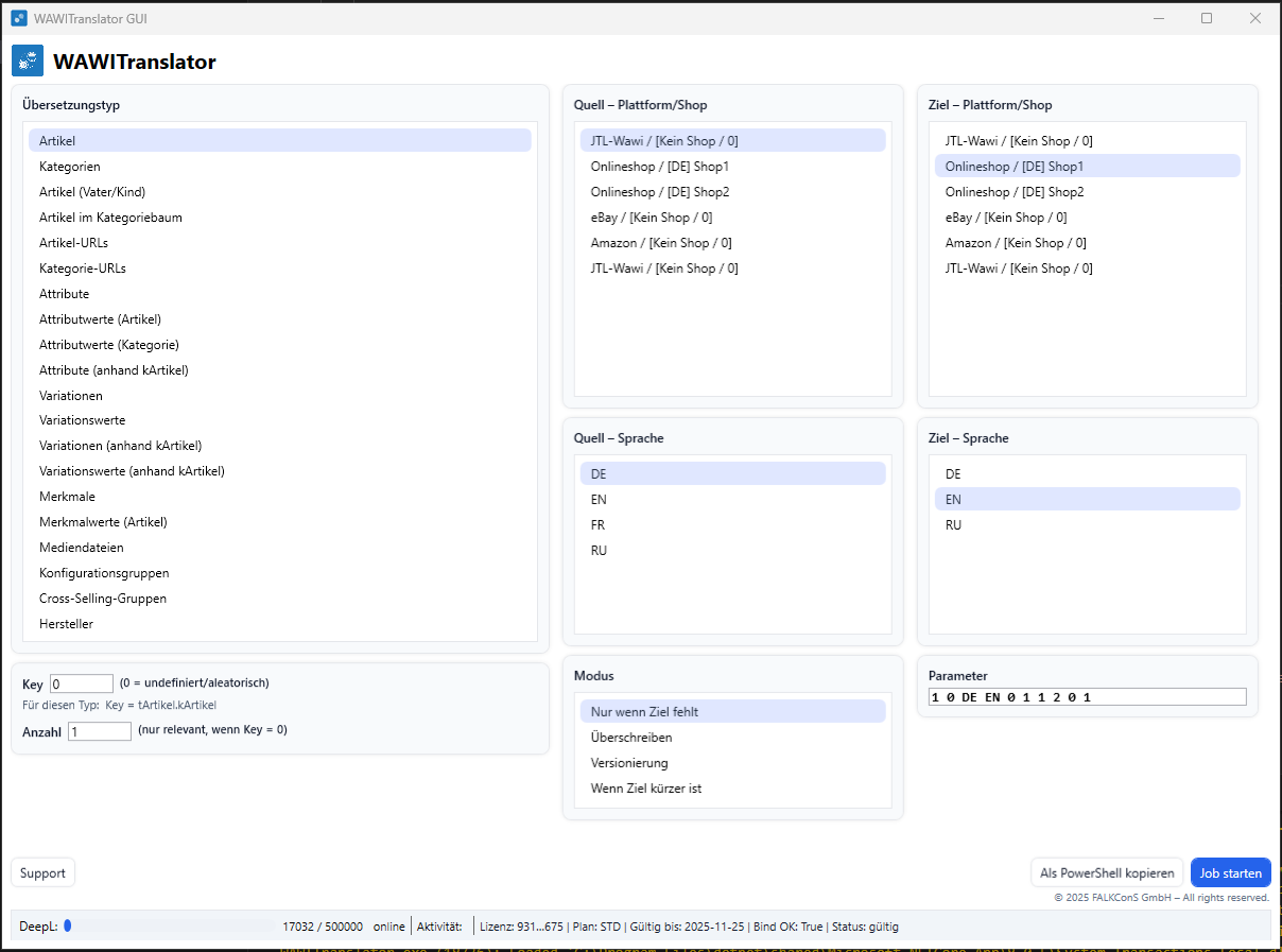 Z.B.: Bei Artikel, Attributen, Merkmale und Merkmalwerte kann hier der interne Schlüssel (dbo.tArtikel.kArtikel bzw. {{ InterneArtikelnummer }}) mitgegeben werden. Für die Stapelverarbeitung setzen wir diesen Parameter auf 0. Bei Kategorien kann hier der interne Schlüssel der Kategorie (dbo.tKategorie.kKategorie) mitgegeben werden. Für die Stapelverarbeitung setzen wir diesen Parameter auf 0. - Der dritte Parameter ist die Ausgangssprache, von der übersetzt werden soll. Dies kann eine beliebige Sprache sein, die in der Wawi aktiviert ist und von DeepL unterstützt wird. Die Sprache wird im Format ISO2 angegeben, z.B. EN für Englisch oder FR für Französisch. Optional kann hier auch z.B. EN-GB für Englisch in Großbritannien (oder EN-US) gewählt werden. Wichtig ist dabei, dass der Bindestrich enthalten ist.