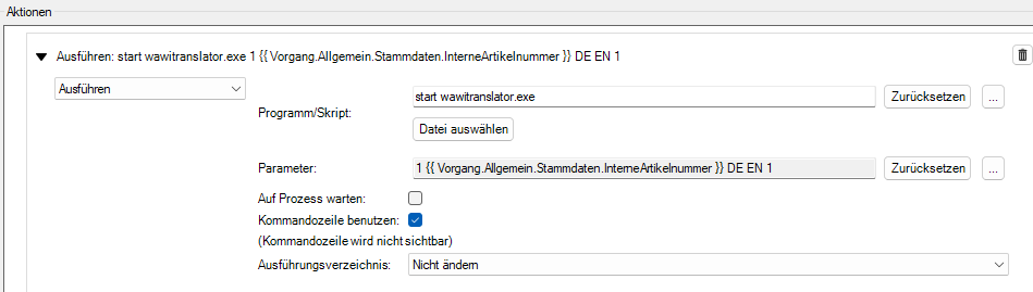 Wichtig: der zweite Parameter muss ggf. mit der internen ID (z.B. InterneArtikelnummer) ersetzt werden, wenn Sie nur einen spezifischen Datensatz (z.B. Artikel) übersetzen möchten. Dies gilt auch bei manuellen Workflows in der JTL-WAWI.